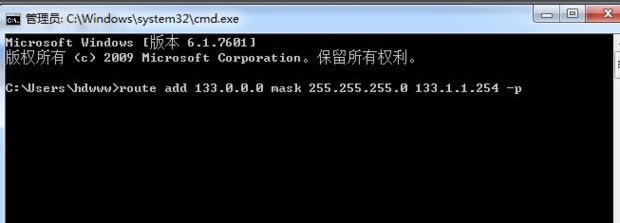2、在CMD内输入 route add 133.0.0.0 mask 255.255.255.0 133.1.1.254 -p