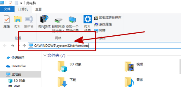 这时大家应该打开此电脑,之后在上面的输入工具栏位置里面输入这样的代码“C:WINDOWSsystem32driversetc”。