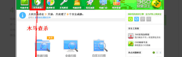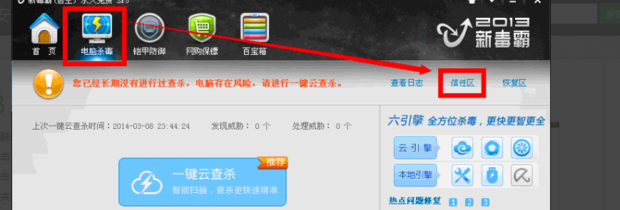 电脑装的是金山杀毒软件,打开金山毒霸,点击“电脑杀毒”—》“信任区”