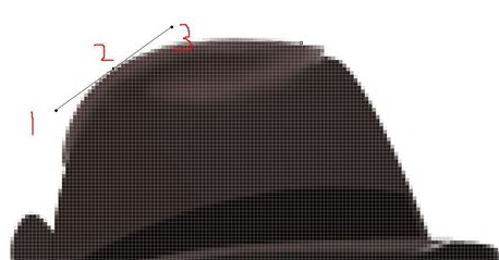 钢笔工具适合将图片放大使用,越大越好,大到可以看到锯齿,抠出来的图就会越自然。首先在人物的任何一个部位作为起点,这里我选择帽子的部位,用钢笔工具单击下会看到一个正方形的小点,然后再找第二个落笔的地方,因为帽子弧度比较大,再第二次落笔时不要松开鼠标,也就是单击不放开鼠标进行拖动,直线会变成弧线,直到跟帽子边缘吻合即可。
