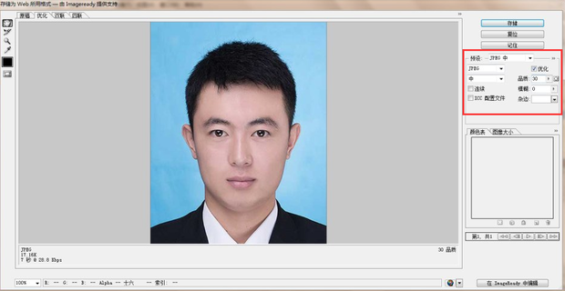 再次点击“文件”—“文件存储为web所用格式”,在弹出界面的右边将品质放到30