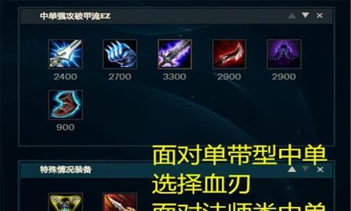 以及其他辅助装备和野怪buff,本文详细介绍了最新版本EZ法强出装的搭配方法和策略,狂徒之怒,魔宗等、其中包括了核心装备电刀。成为真正的ADC、通过合理选择出装、相信每位玩家都能够在游戏中取得更好的成绩,提高技能伤害和生存能力!