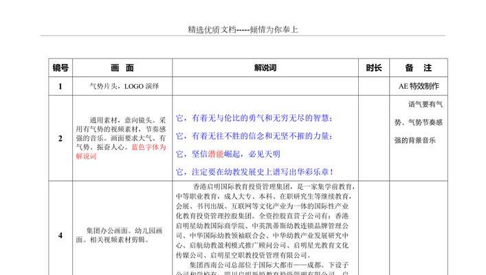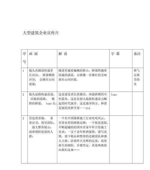 宣传片成为了一种广泛应用于各类机构和企业的重要宣传工具,在现代社会。要制作一部成功的宣传片并不容易,然而、其中一个关键因素就是脚本的撰写。并激发他们的兴趣、一个精心设计的脚本可以有效地传达信息,吸引观众。达到预期的宣传目标,帮助读者提升宣传片效果,本文将介绍一份以3分钟宣传片脚本模板为主题的文章、探讨宣传片脚本撰写的关键要点。