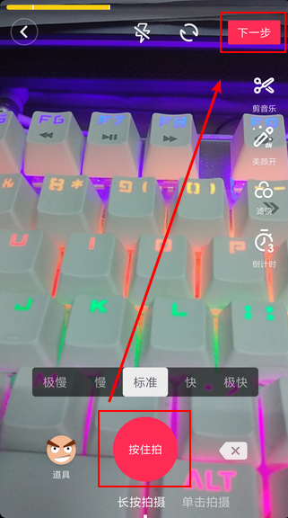 按住拍摄,拍摄完成后点击“下一步”