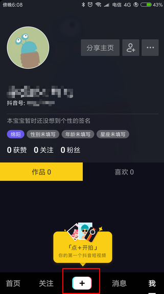 点击底部中间的“+”,拍摄短视频。